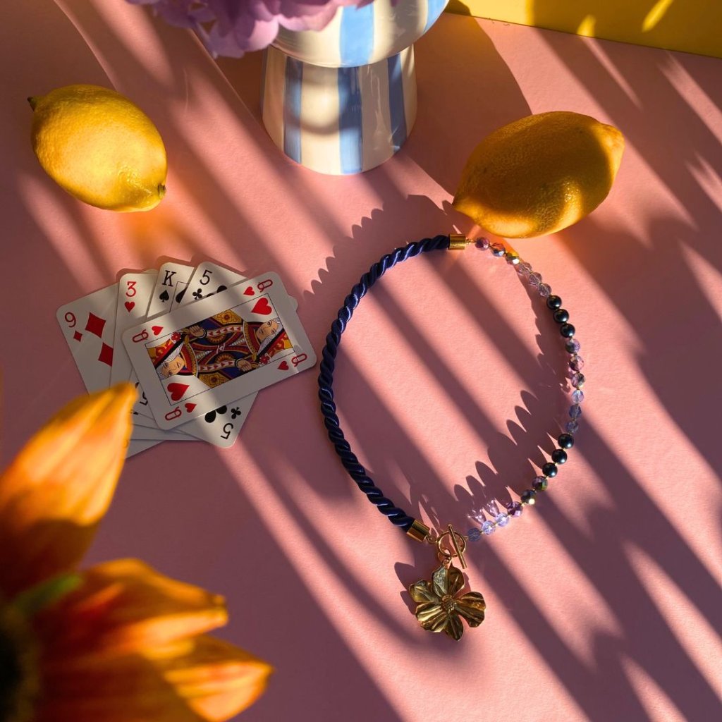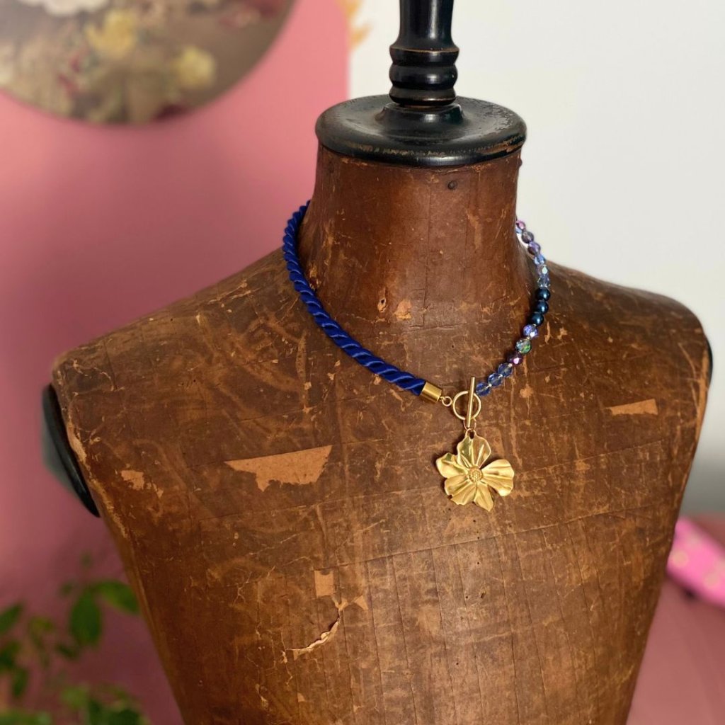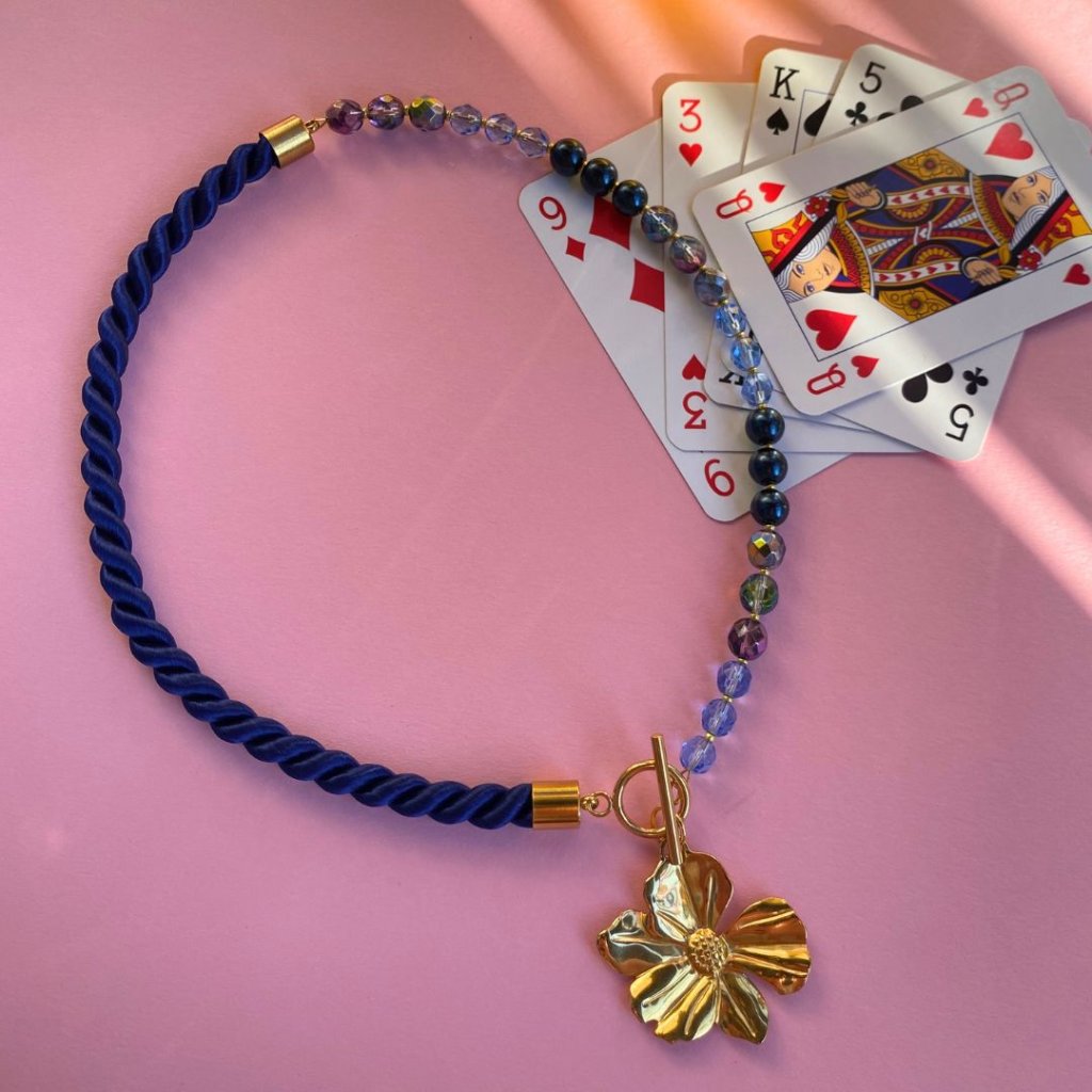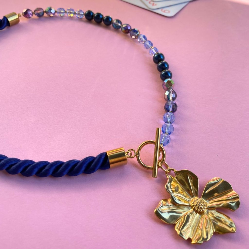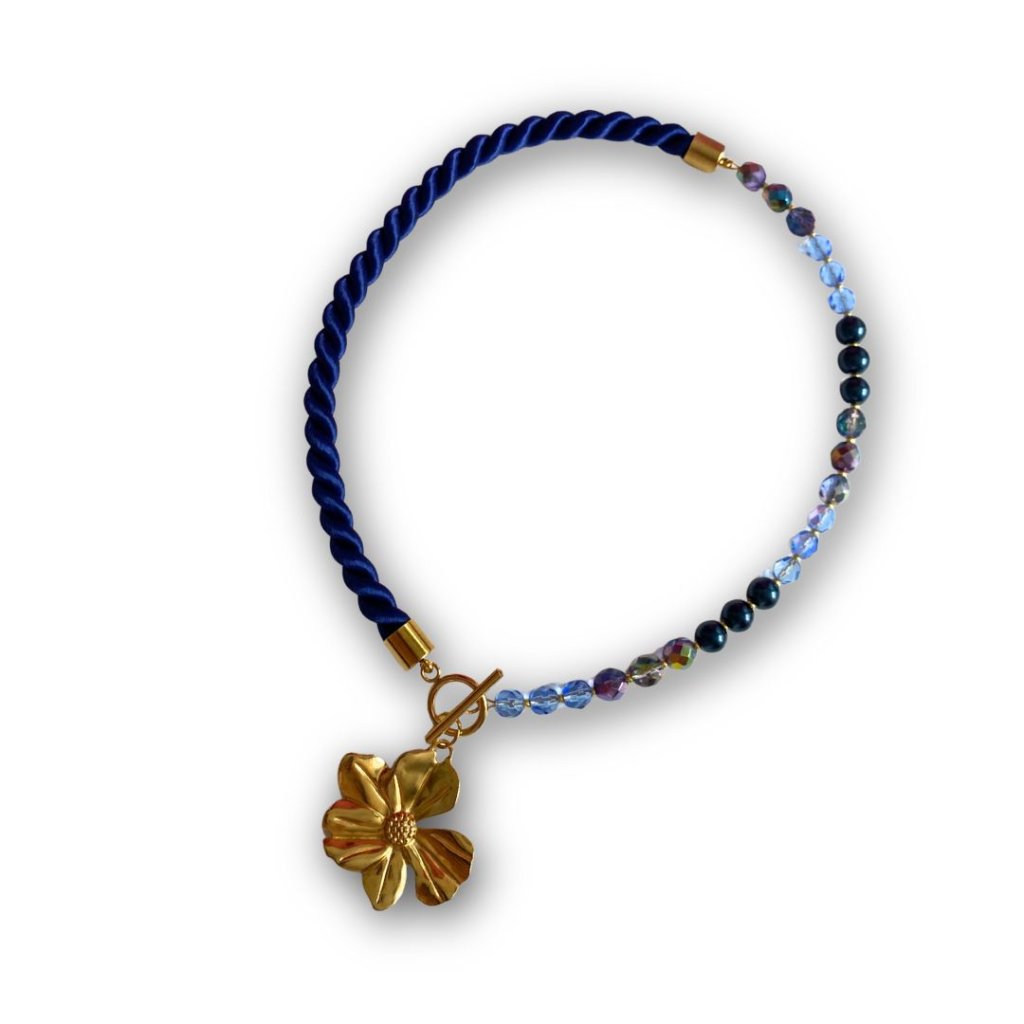 ✨ Saténové kroucené lano v tmavě modré barvě, perly, broušené skleněné korálky a nádherný zlatý přívěsek: kvítek 🌼✨