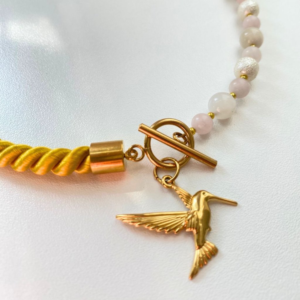 ✨ Saténové kroucené lano ve zlatavé barvě, růženín, měsíční kámen a voskované zdobené perly, doplněné o nádherný zlatý přívěsek z nerezové oceli: kolibřík🌼✨