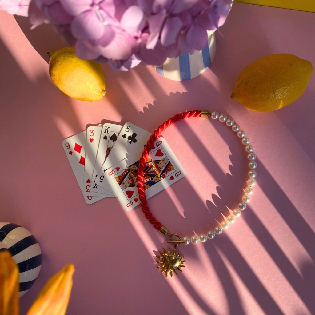 ✨ Saténové kroucené lano v černé nebo červené barvě s nadčasovými perlami, a k tomu nádherný zlatý přívěsek: srdce s paprsky 🌞✨