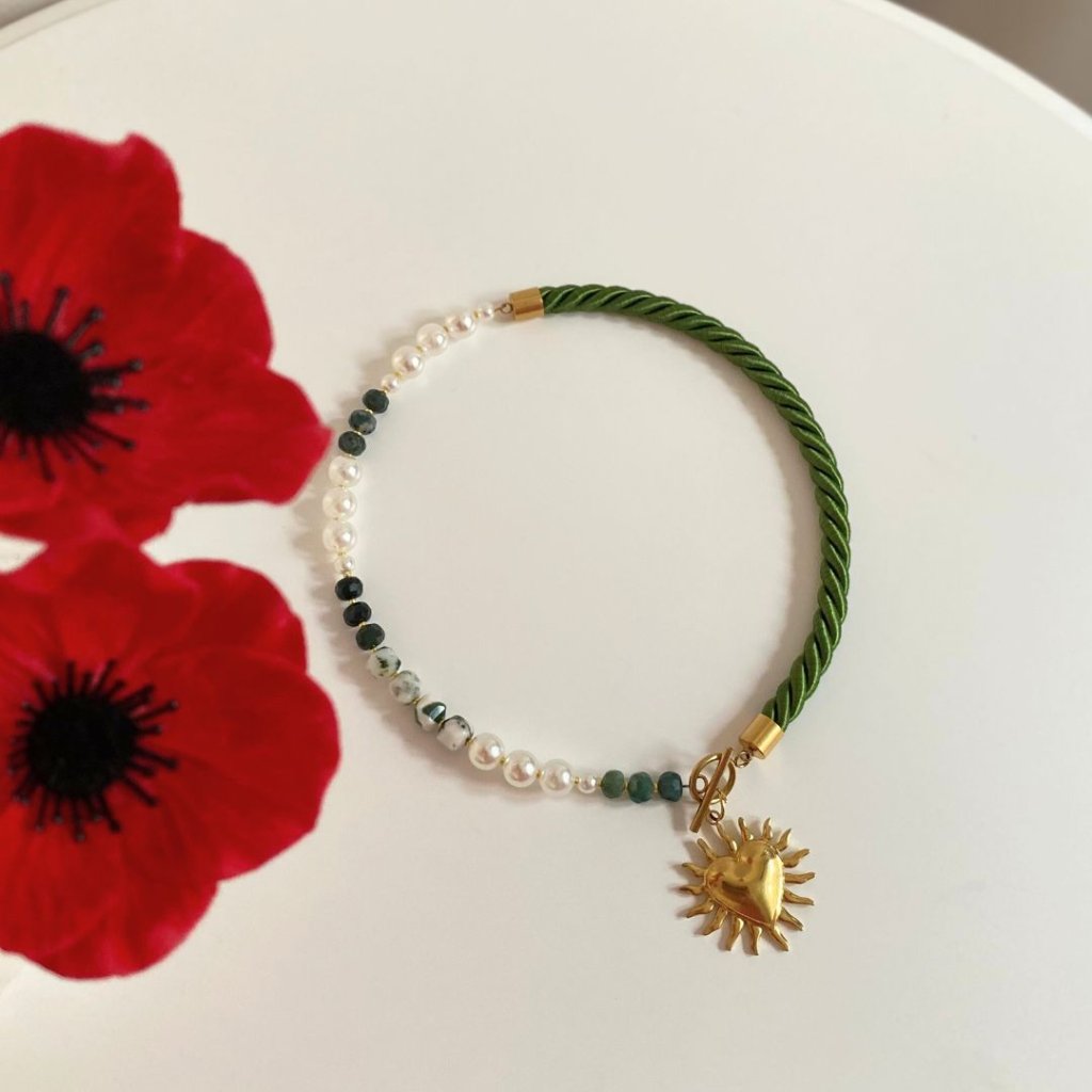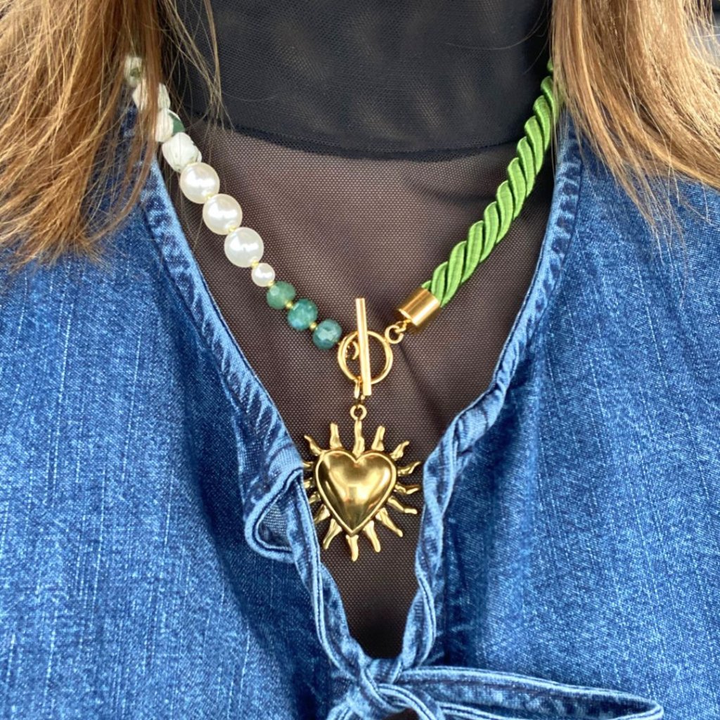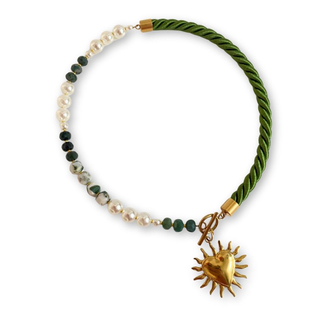 ✨ Saténové kroucené lano v zelenkavé barvě, perly, perličky, stromečkový achát a nádherný zlatý přívěsek: srdce s paprsky 🌞✨