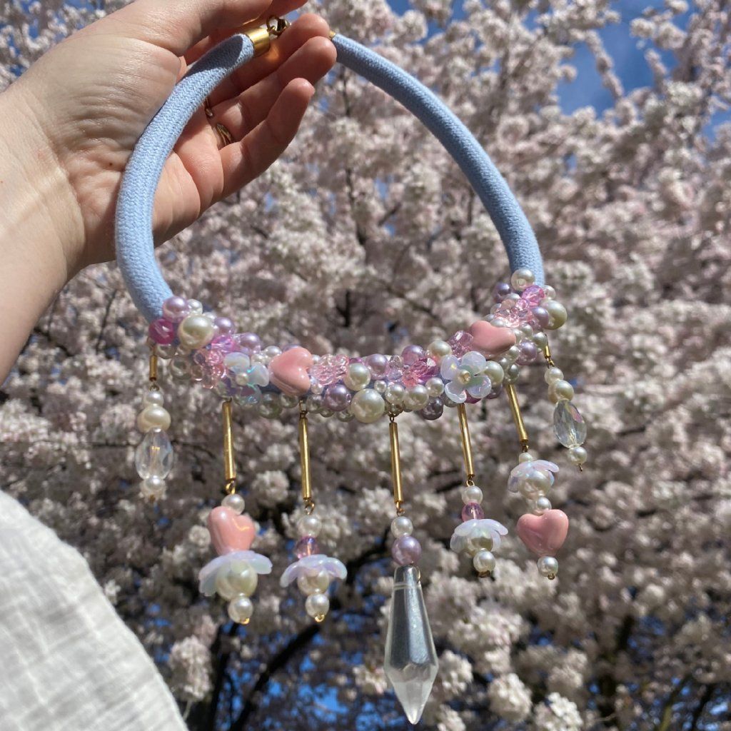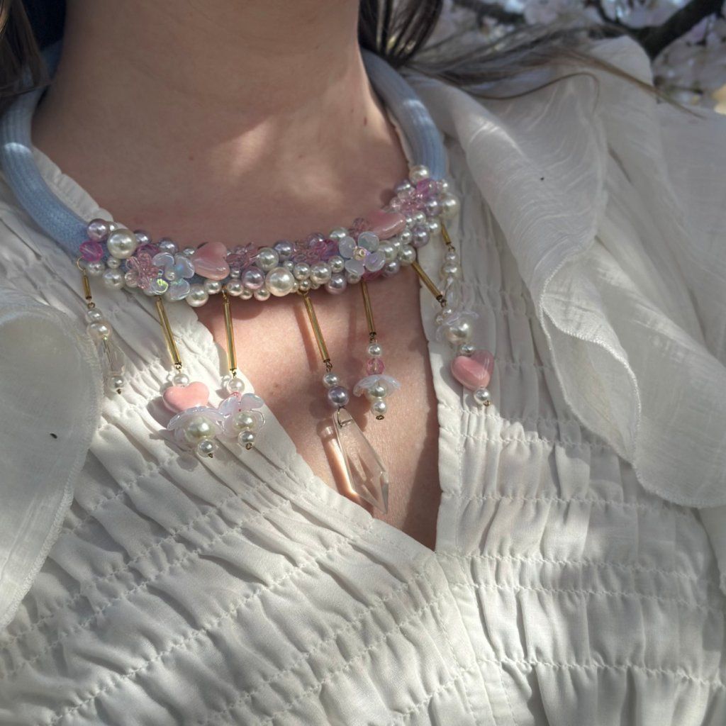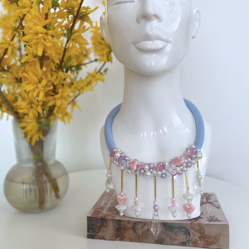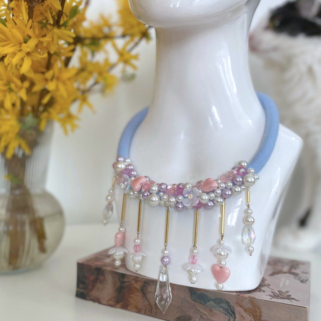 Náhrdelník je ručně pošitý perlami, perličkami, korálky, porcelánovými srdíčky a akrylovými kvítky. Vše v něžných pastelových barvách. 💖