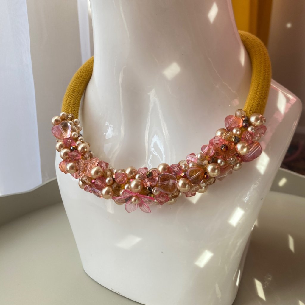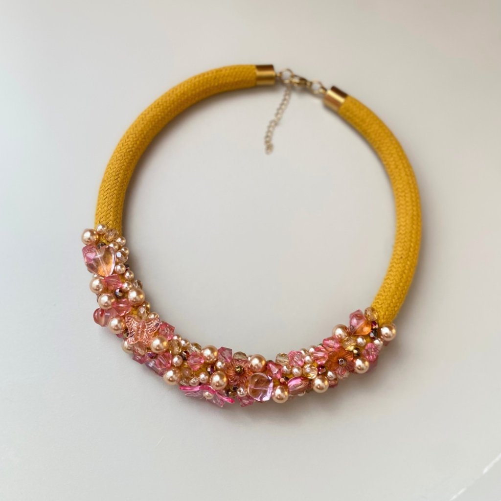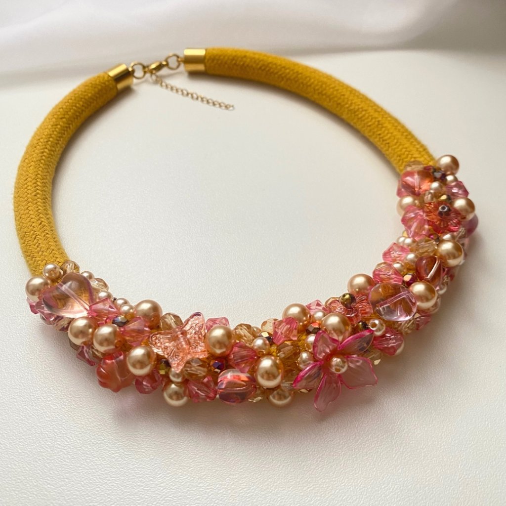 ✨ Bavlněné hořčicové lano, ručně pošité voskovými perlami, skleněnými korálky různých tvarů (květinky, oválky, motýlci) a broušenými skleněnými korálky ve zlaté barvě.✨