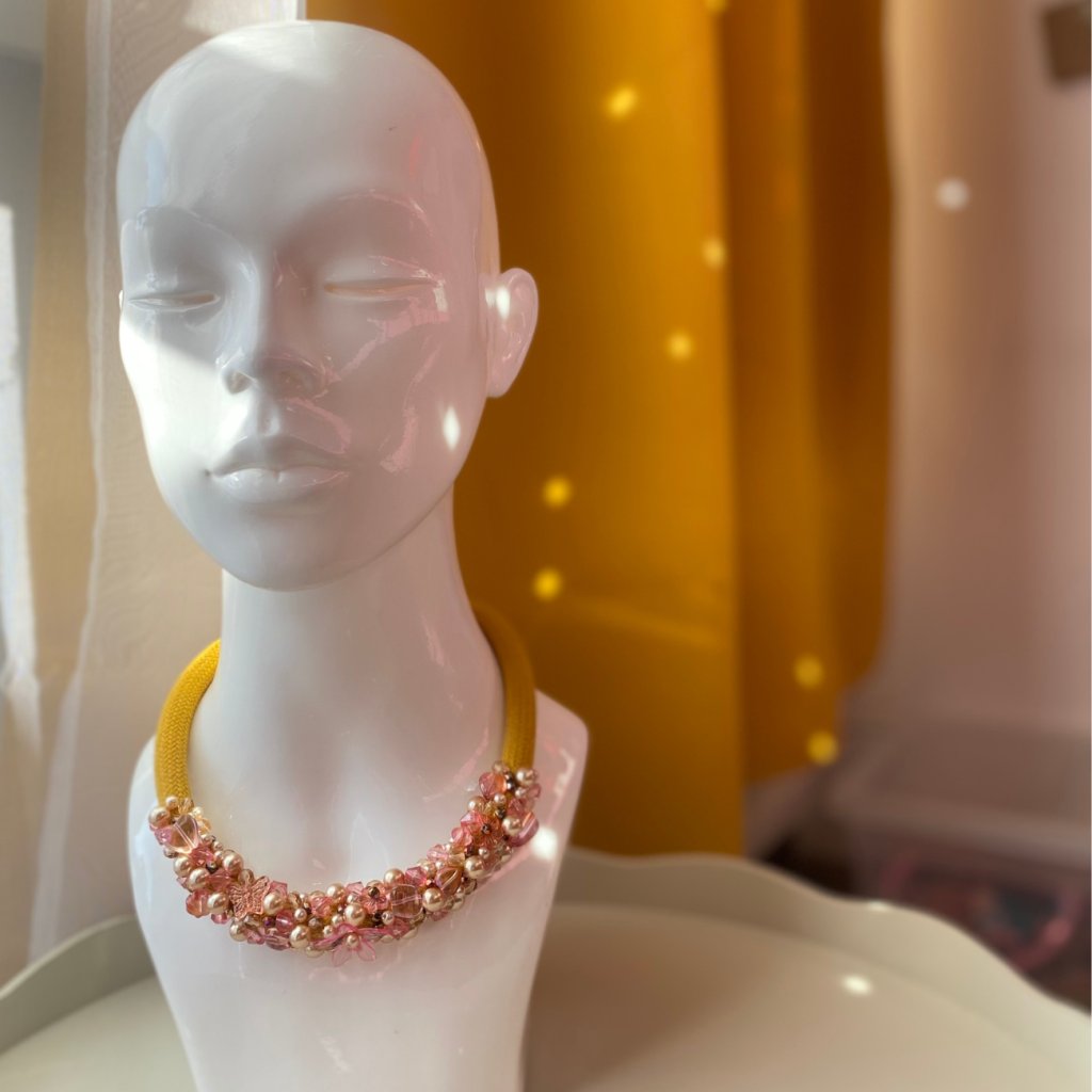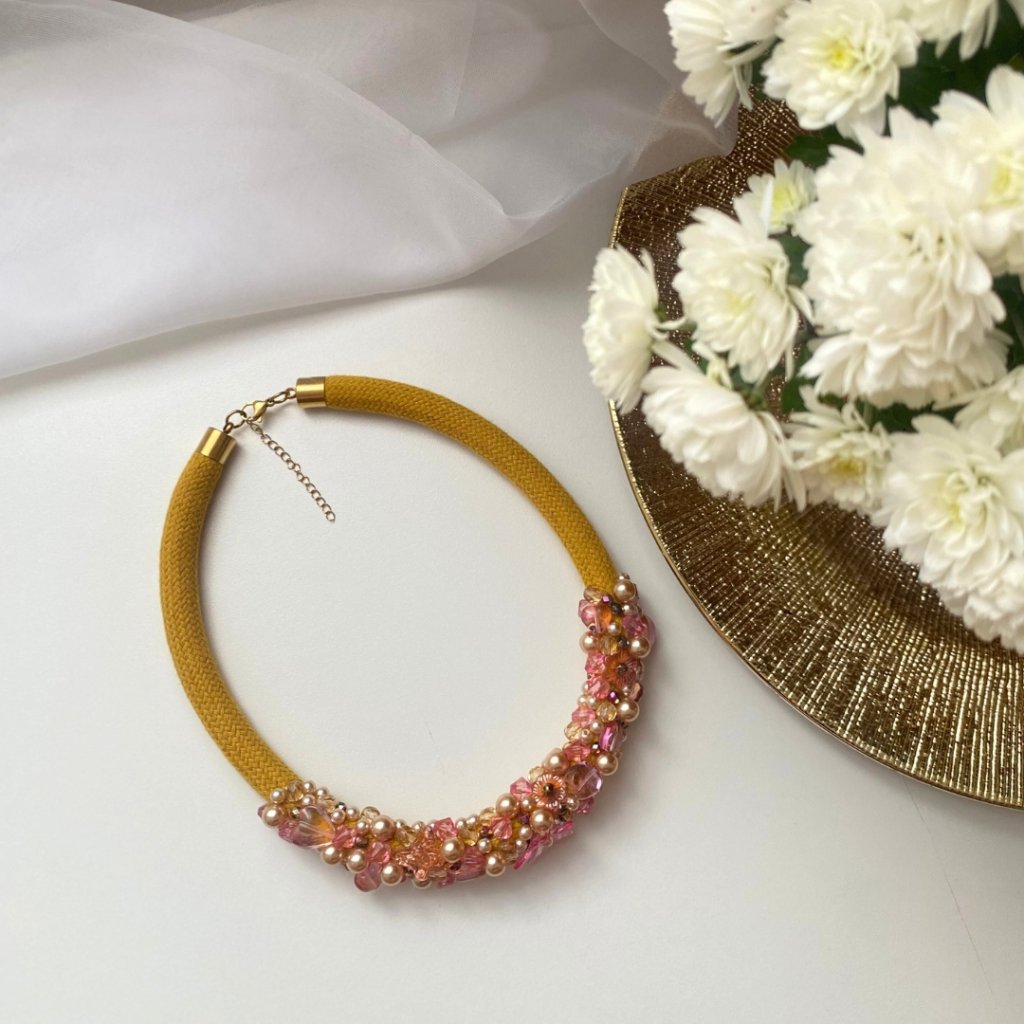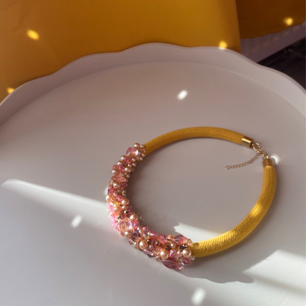 ✨ Bavlněné hořčicové lano, ručně pošité voskovými perlami, skleněnými korálky různých tvarů (květinky, oválky, motýlci) a broušenými skleněnými korálky ve zlaté barvě.✨