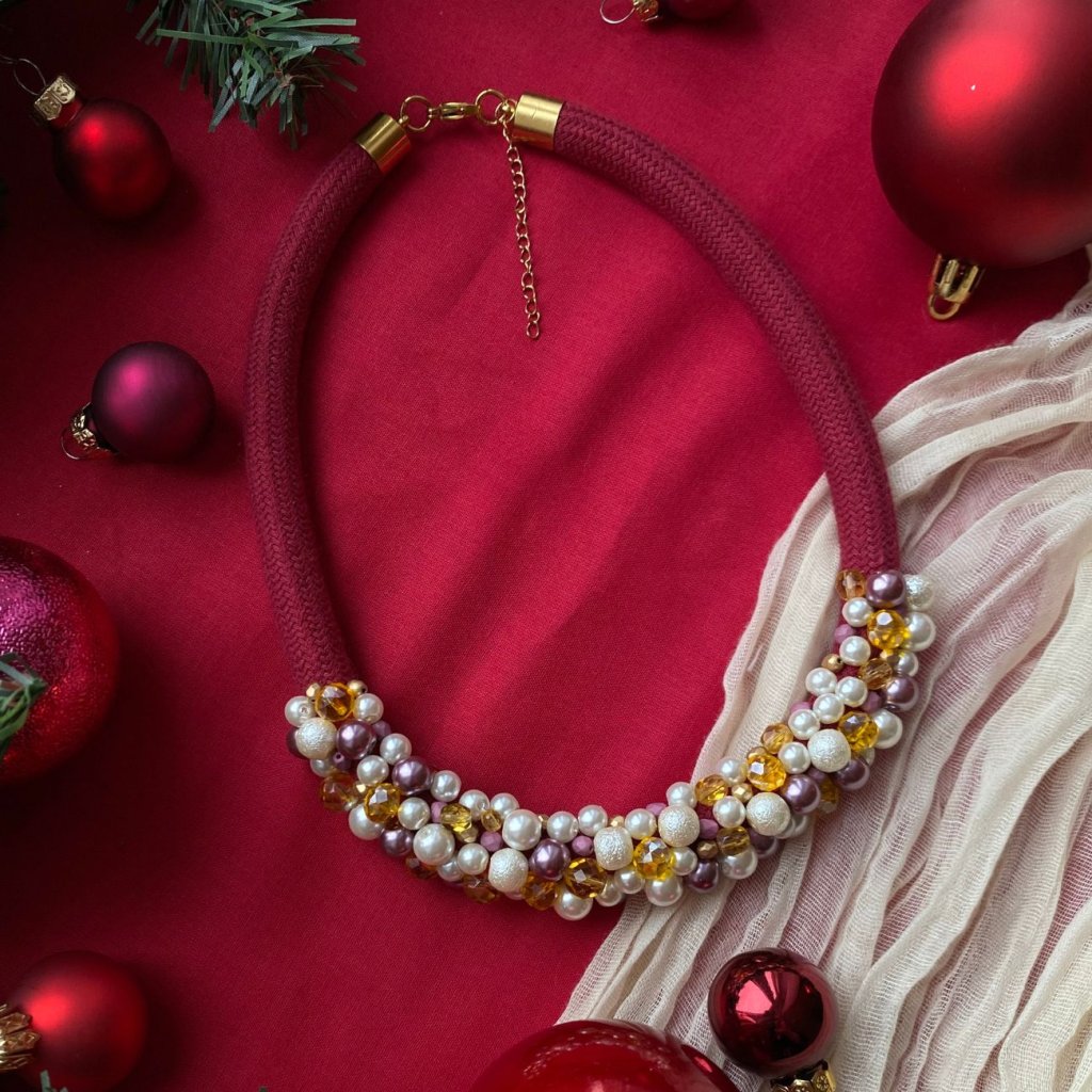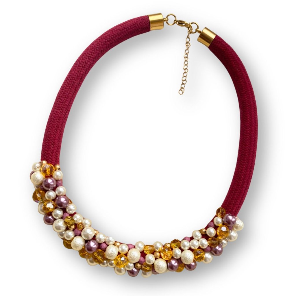 ✨ Bavlněný bordó náhrdelník z lana, ručně pošitý skleněnými broušenými korálky a voskovými perlami ve žluté, krémové, zlaté a lila barvě ✨
