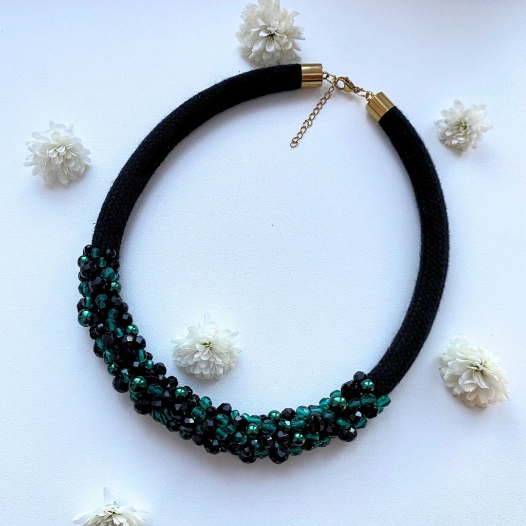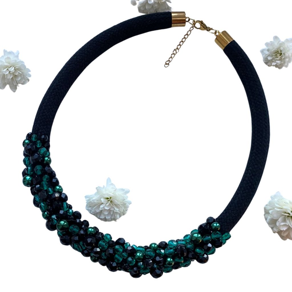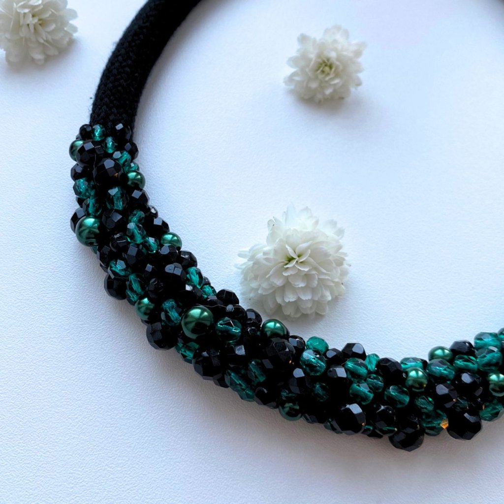 ✨ Černé bavlněné lano ručně pošité broušenými skleněnými korálky v barvách černé a smaragdové, doplněné voskovými perlami v zelené barvě ✨